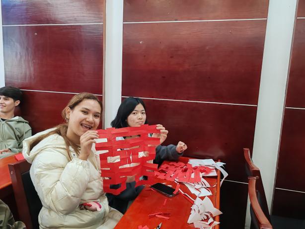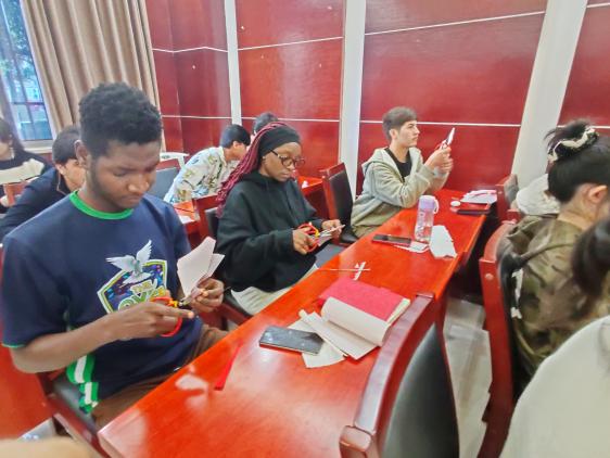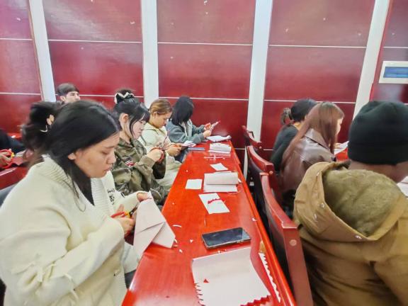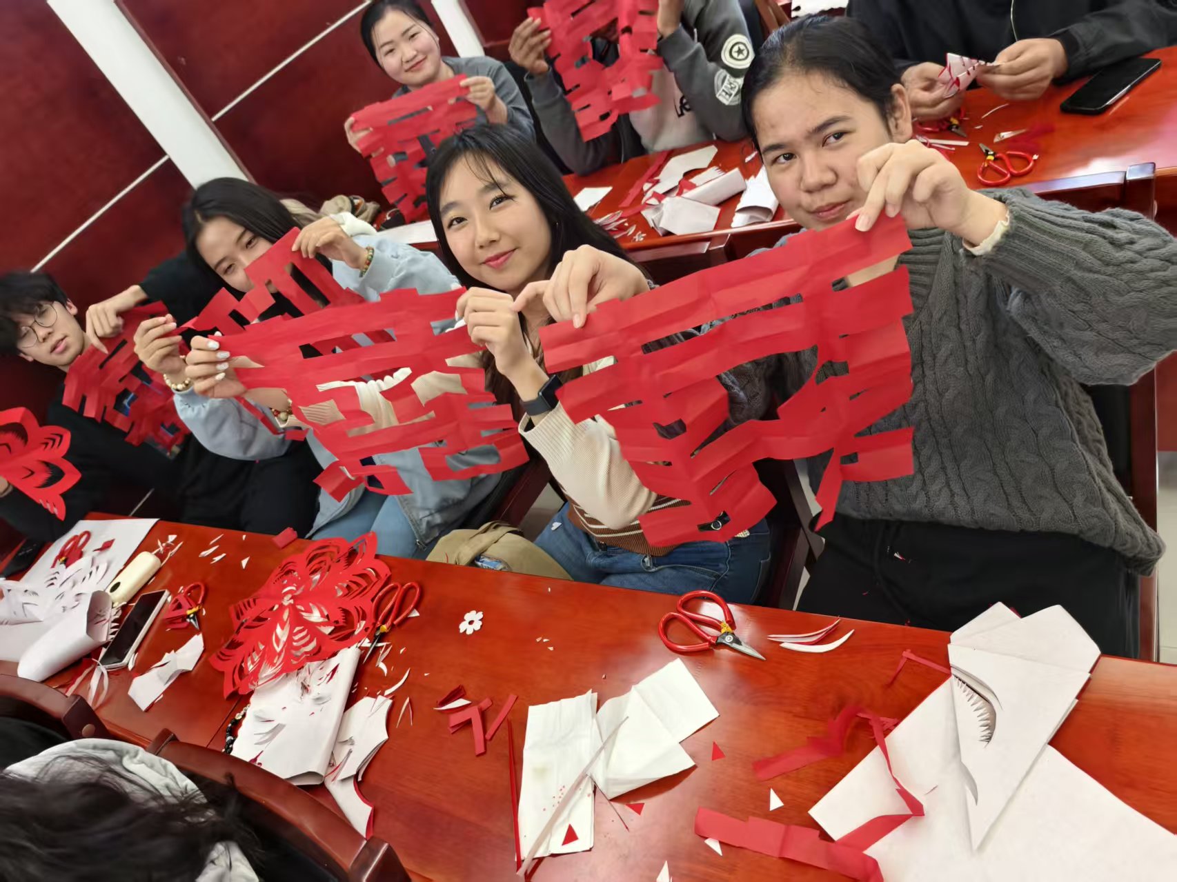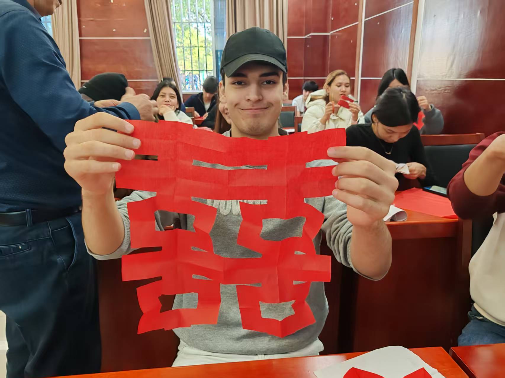 实践环节中,向老师现场示范了剪纸的基本技法,并指导同学们动手体验。从简单的花样到寓意吉祥的“囍”字,留学生们在老师的耐心指导下,一步步剪出属于自己的作品。活动现场气氛热烈,留学生们表现出浓厚的兴趣与热情,纷纷举起手中的红纸与剪刀,沉浸在剪纸创作的乐趣中。