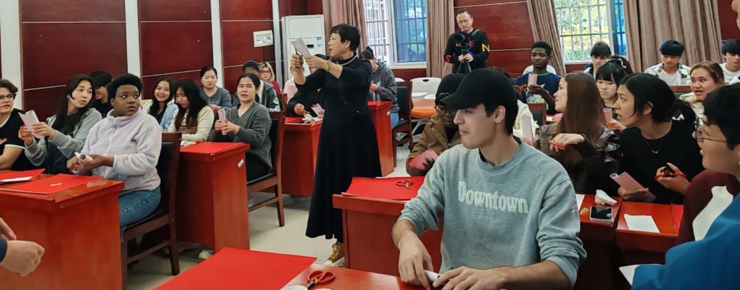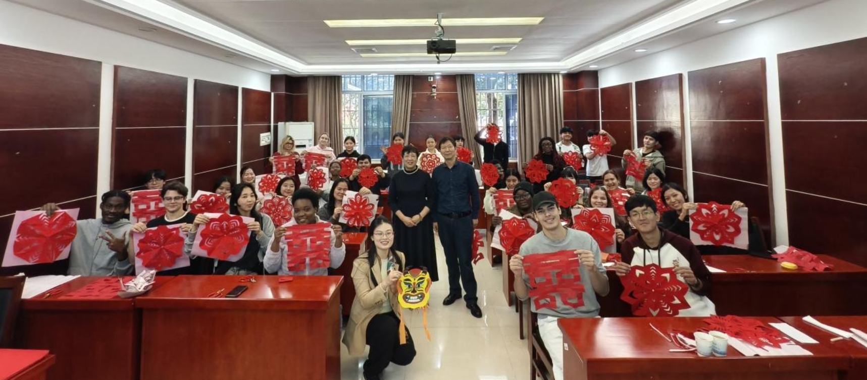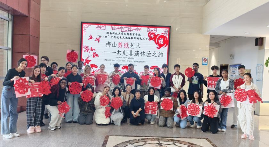2025年11月14日下午,湖南科技大学国际教育学院在A201教室成功举办了第二十三期“和·合”中外优秀文化体验活动。本次活动以“梅山剪纸艺术”为主题,特邀国家级非遗传承人向亮晶老师担任主讲,带领来自世界各地的留学生们走进剪纸的艺术世界,感受中国传统民间文化的独特魅力。